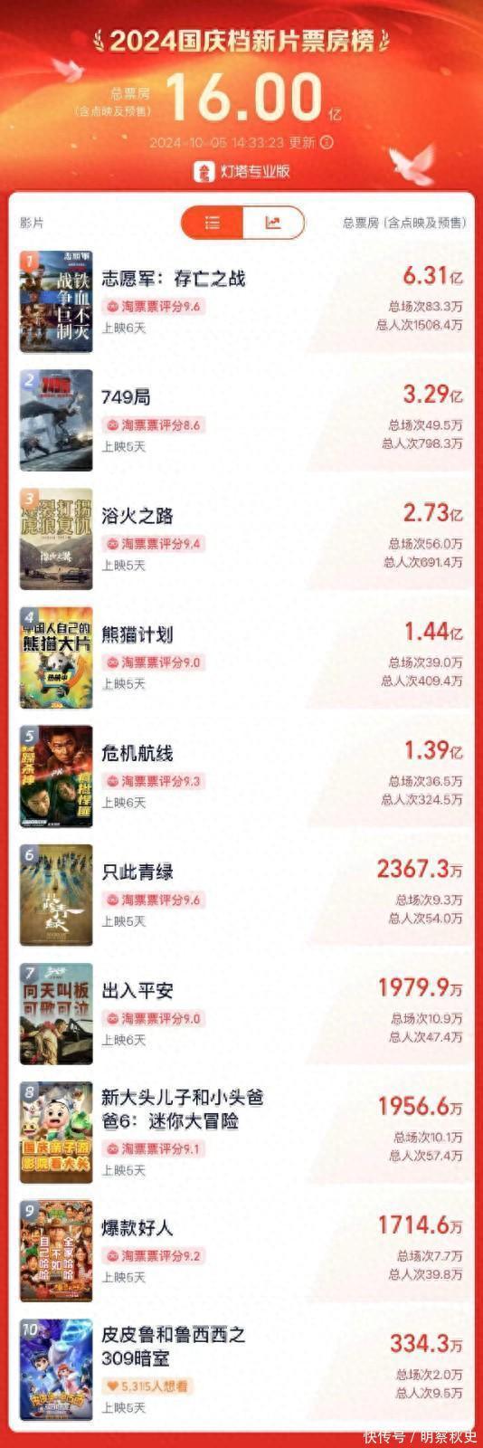 1905电影网讯据灯塔专业版,截至10月5日14时33分,2024年国庆档(10月1日—10月7日)档期内总票房(含预售)突破16亿。《志愿军:存亡之战》《749局》《浴火之路》暂列新片票房前三名。今年国庆档相较于往年,影片涵盖剧情、动作、科幻、犯罪、歌舞、喜剧等14种类型,最为多元。